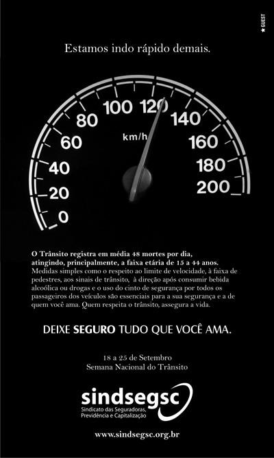Encomendada pelo SindsegSC, entidade que reúne as maiores empresas do ramo de seguros, capitalização e previdência privada de Santa Catarina, Guest lança anúncio institucional pela Segurança no Trânsito. O objetivo do SinsegSC é contribuir com a campanha de conscientização dos condutores de veículos automotores para a prática da direção responsável, com o que se obterá uma redução no número de acidentes. O anúncio foi publicado no dia 25/9 nos principais jornais de SC.