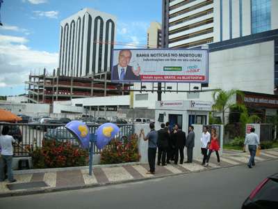 Thank you for reading this post, don't forget to subscribe!Localizado no centro financeiro da cidade (av. Tancredo Neves ), o outdoor divulga uma campanha do blog Bahia Notícias do jornalista Samuel Celestino, que já pode ser acessado pelo celular, através do mobtour. Um equipamento acoplado ao painel dispara, via bluetooth, num raio de 70 metros o aplicativo para todos os celulares com conexão que aceitarem o envio.